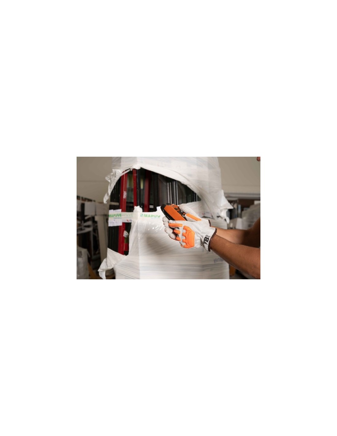 Serraje vacuno, piel natural que facilita la transpiración de la mano. Interior en para-aramida y fibra de vidrio, aumenta la protección frente al corte y calor. Cosido con hilo para-aramida, aumenta la durabilidad de las costuras frente a laceraciones y cortes provocados por aristas y objetos cortantes. Dorso caucho termoplástico TPR, proporciona al usuario protección frente a aplastamiento y golpes en los trabajos con riesgo de impactos en el dorso. Indicado para industrias que trabajan en cadenas de montaje con piezas de gran envergadura y con riesgo de atrapamiento.