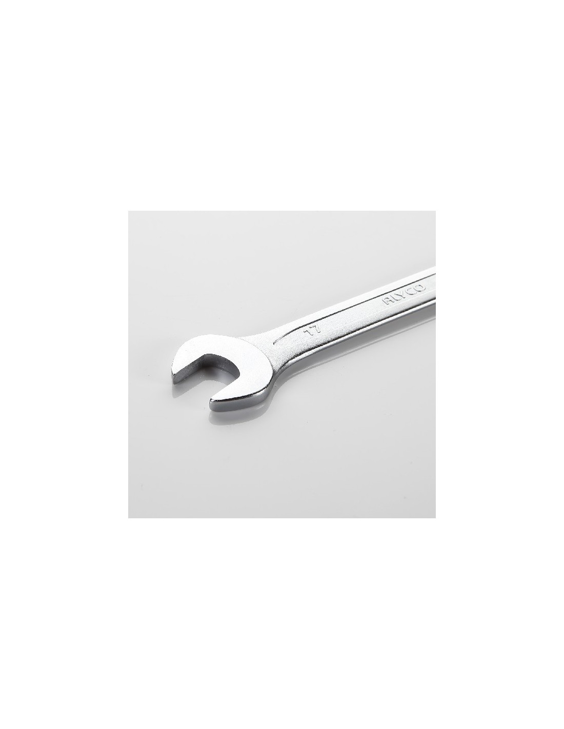 Llave fija de dos bocas abiertas, fabricada en Acero al Cromo-Vanadio, forjada de una sola pieza, endurecida por tratamiento térmico, y con tratamiento superficial de cromado para evitar la oxidación. Perfil fino y acodado de 30º que facilita el acceso a lugares dificiles.
