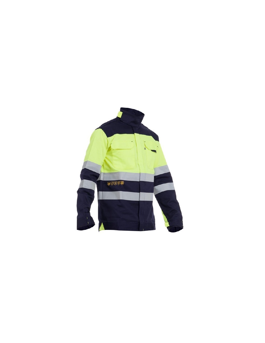 Cazadora multinorma alta visibilidad. Ignífuga, antiestática y protección contra arco eléctrico. Cierre de cremallera con tapa de solapa de velcro. 2 bolsillos en el pecho con solapa de velcro. Rayas reflectantes cosidas de 5 cm alrededor de mangas y cintura. Con tejido flúor. Ajuste de velcro en los puños de las mangas y el cuello para mayor seguridad. Base: 99% algodón y 1% fibra antiestática. Gramaje: 260 gramos • Flúor: modacrílico multifibra.