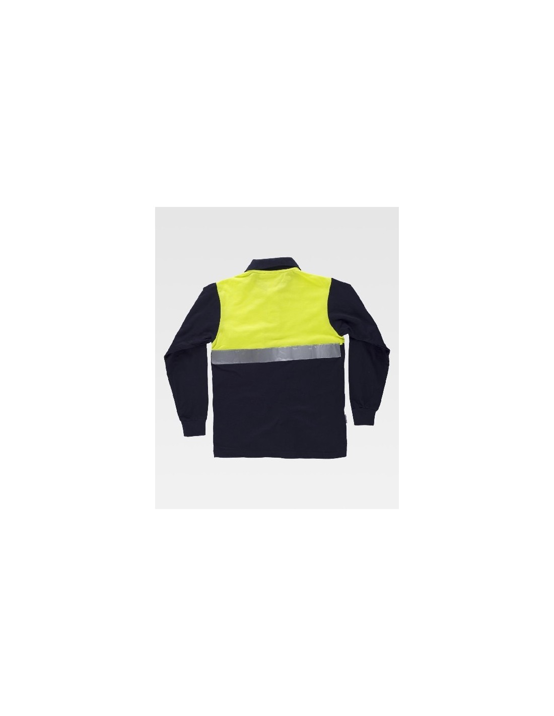 Polo combinado de manga larga en tejido piqué de algodón con cinta reflectante. Parte superior de alta visibilidad. Una cinta reflectante en pecho y espalda. ejido principal: 100% Algodón. Tejido secundario A.V: 65% Poliéster 35% Algodón